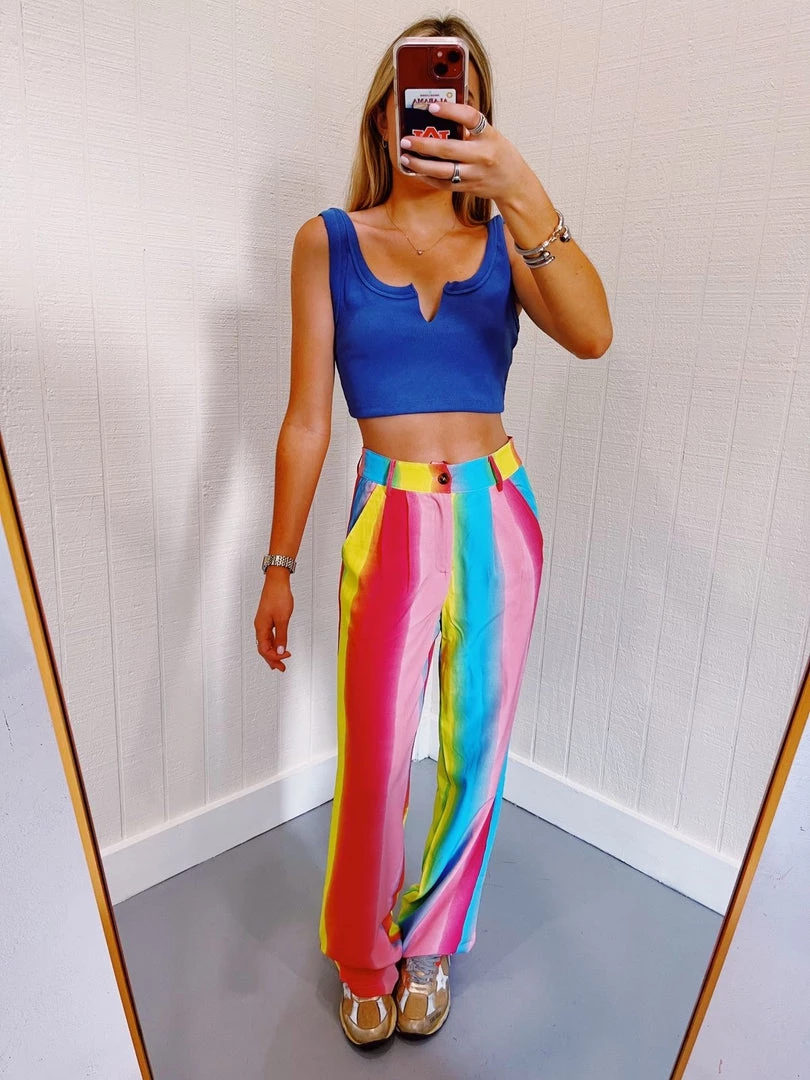 Relaxed fit ombre rainbow pants with a button and zipper closure!