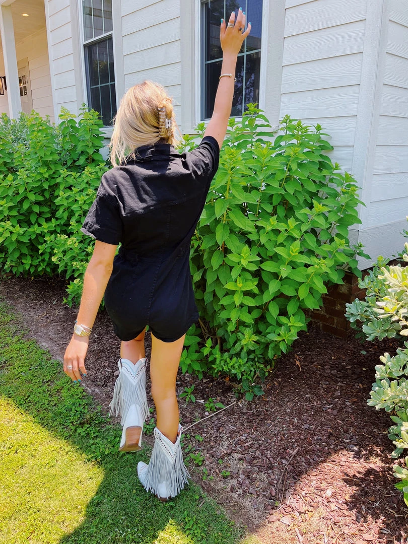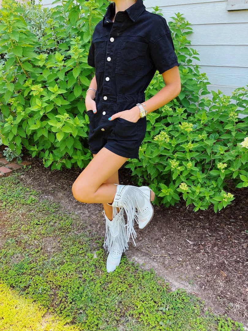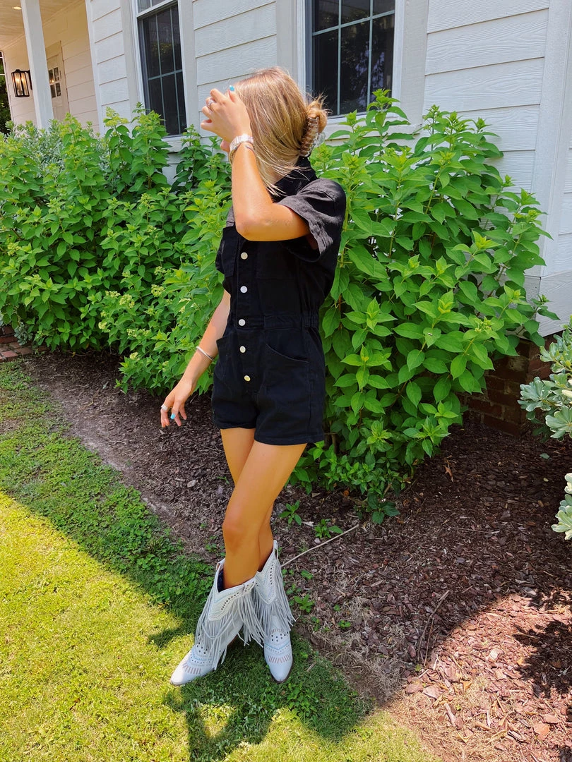 Washed denim romper with a full button closure and functional pockets! Elastic waist.