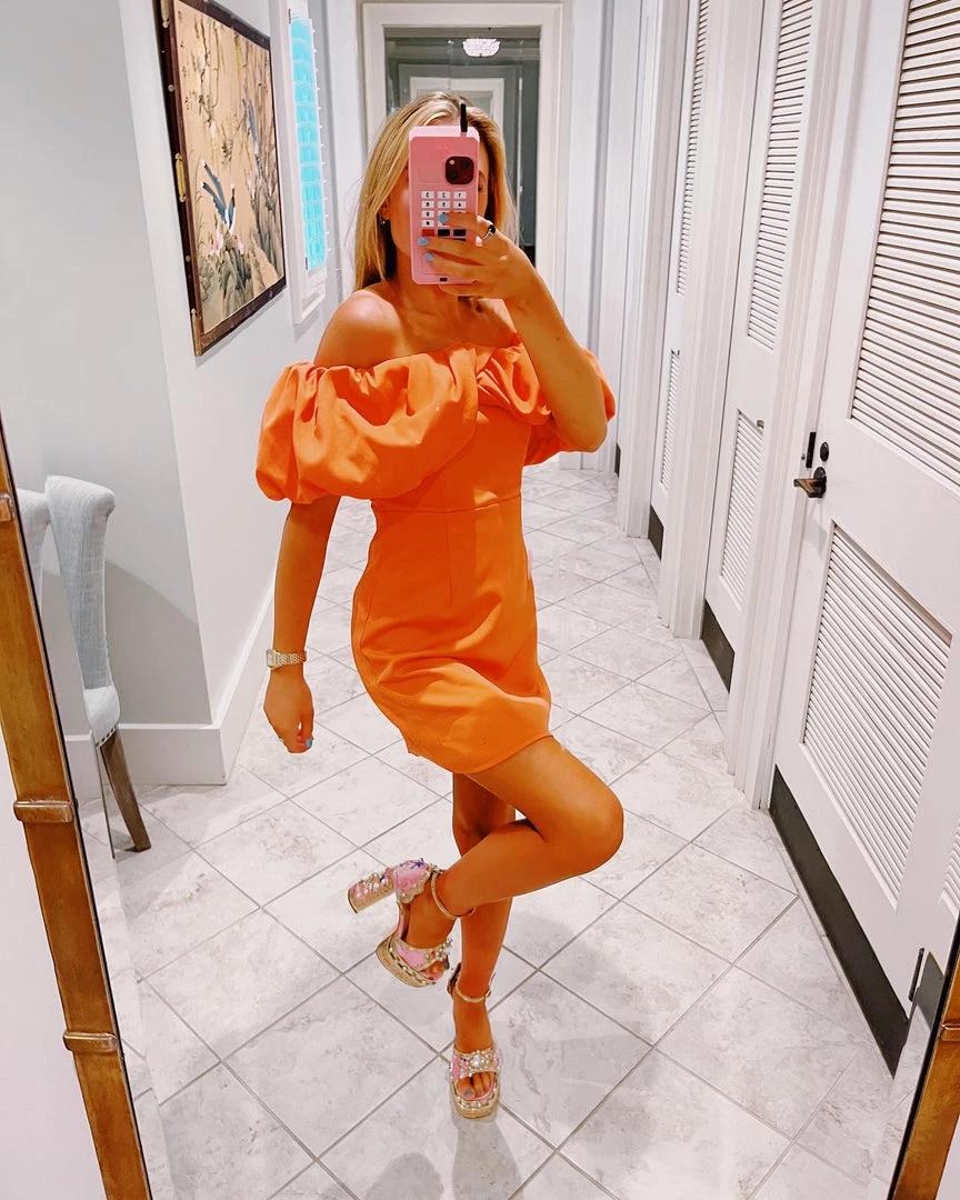 Sunkist orange puff sleeve off the shoulder dress