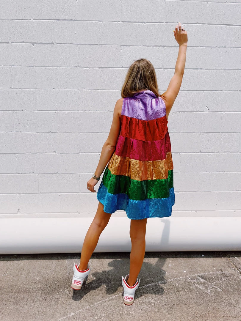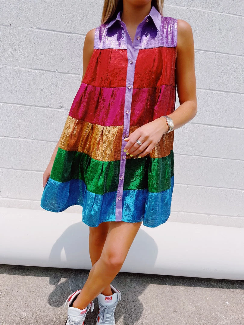 Queen of Sparkles rainbow full sequin tiered dress with a button front closure and collar!