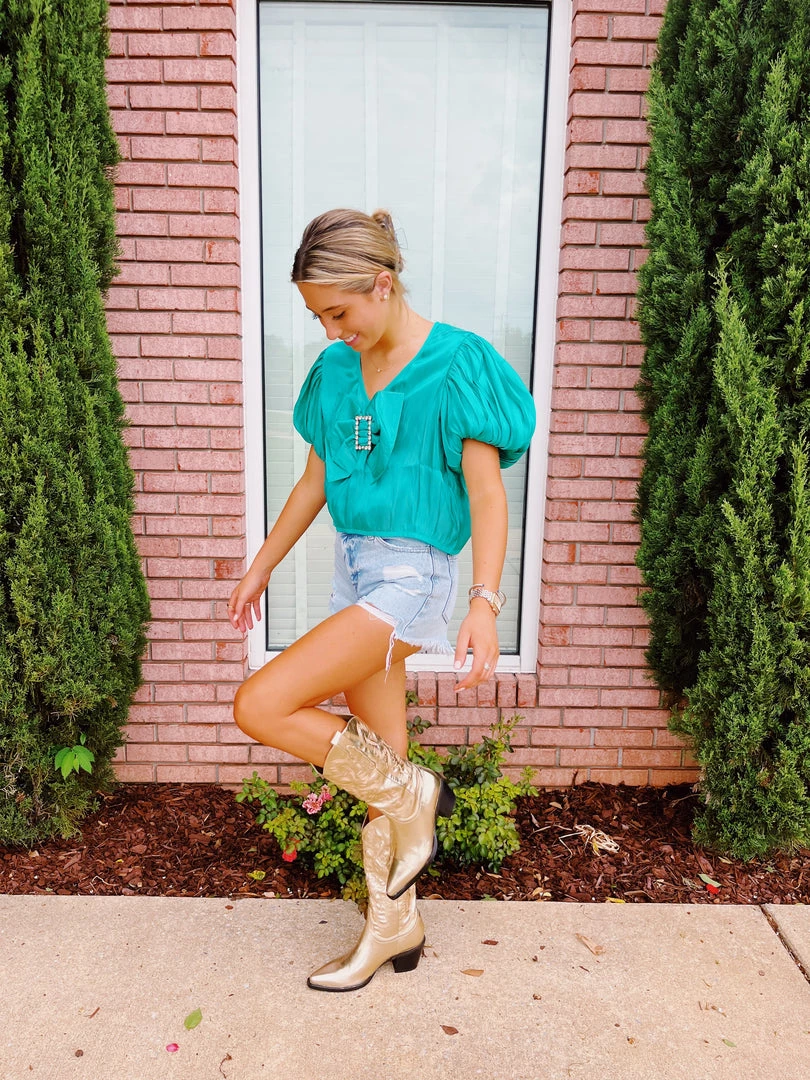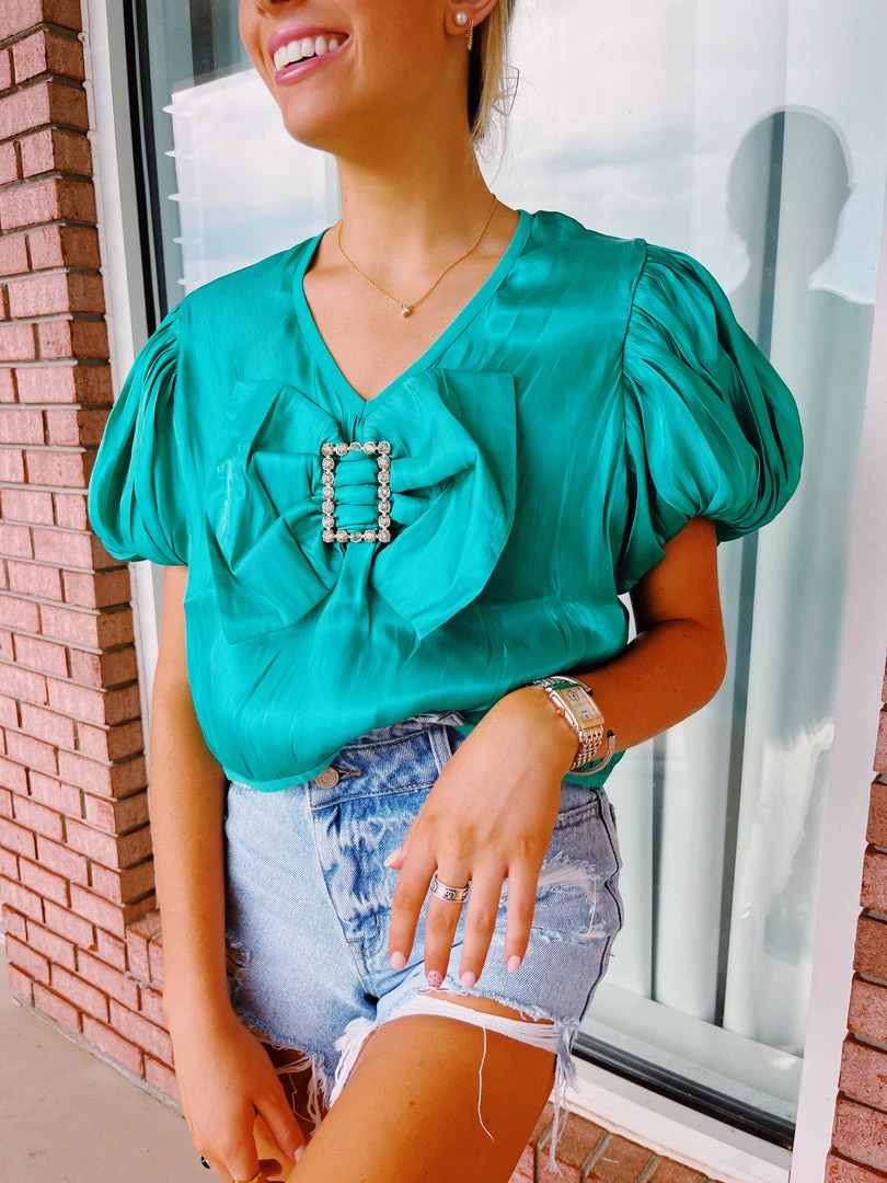 We love this fun little blouse with a bow and broach on the front!