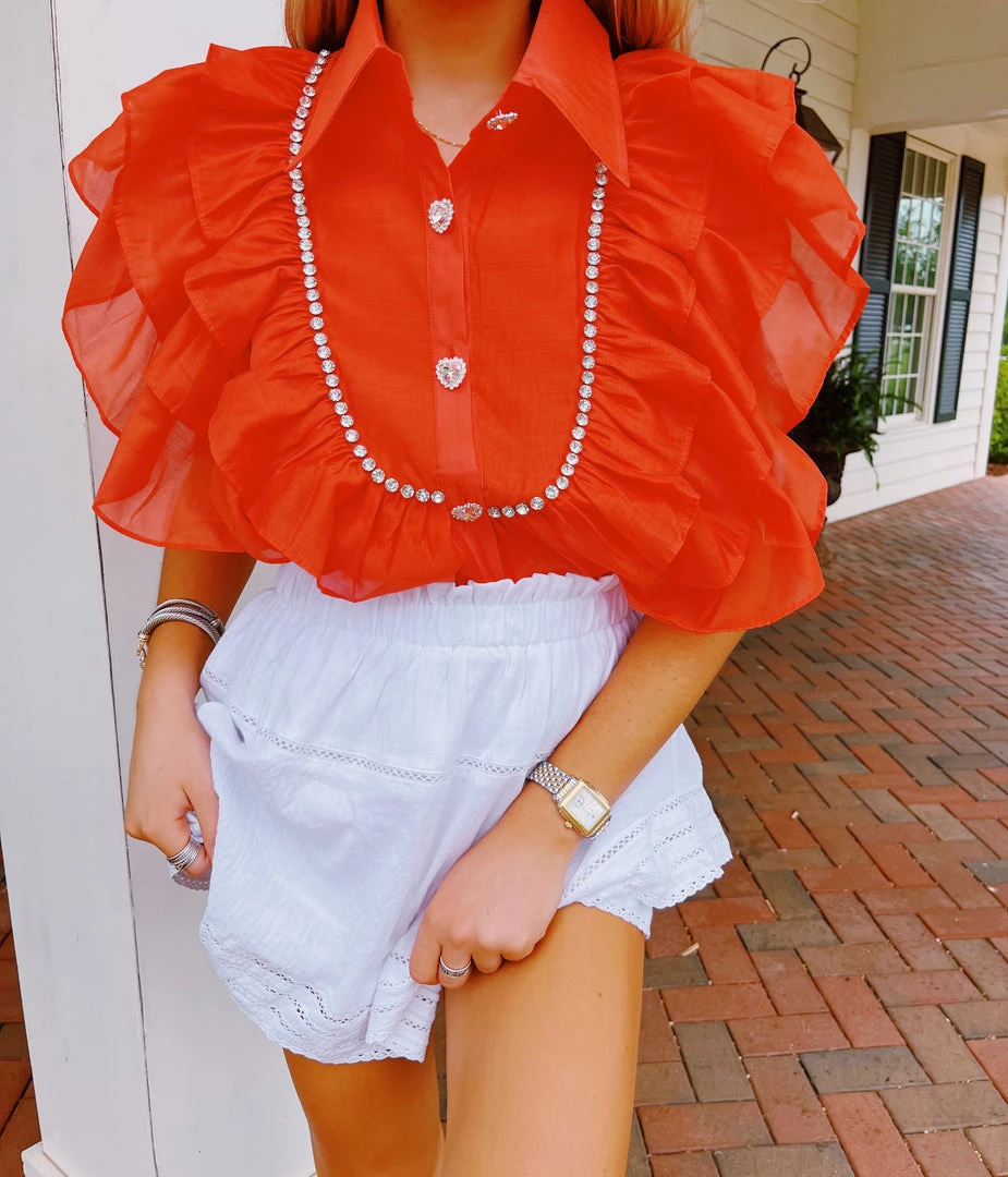 Short sleeve button down ruffle blouse with rhinestone and crystal detailing!