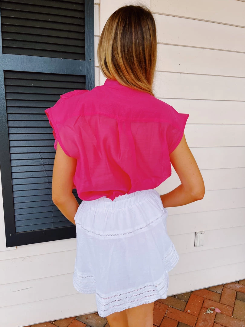 Short sleeve button down ruffle blouse with rhinestone and crystal detailing!