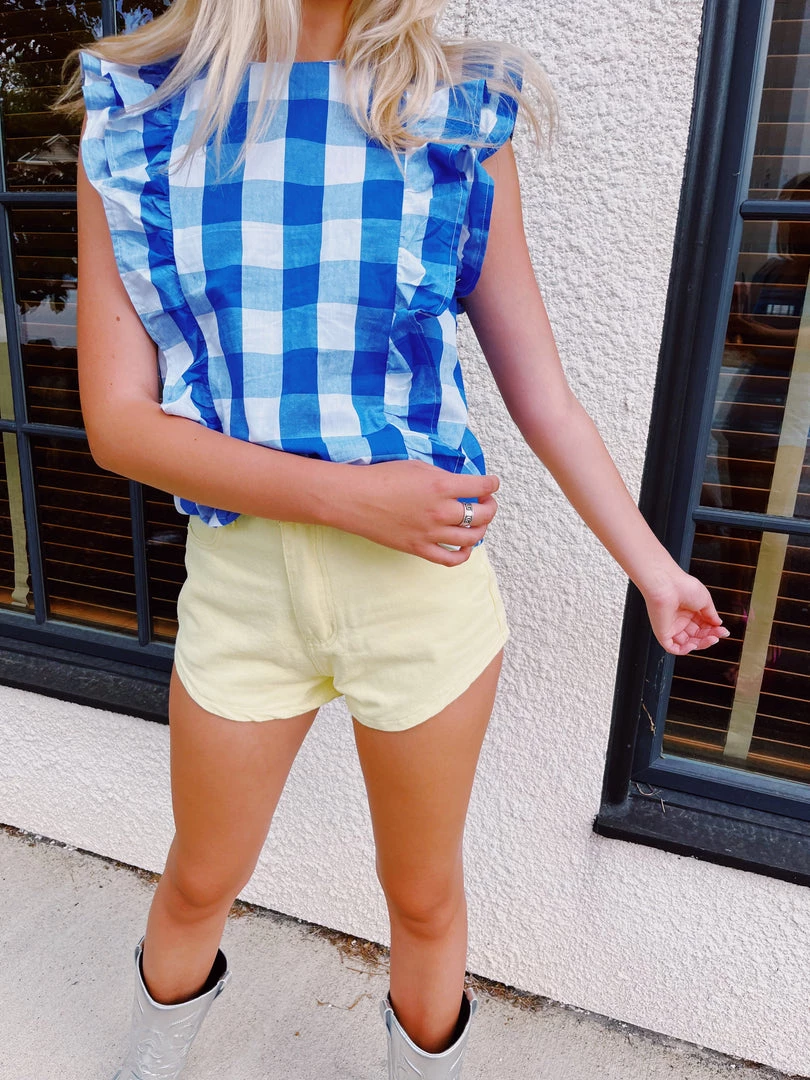 Romantic checkered print top with ruffle details along the side. Functional buttons along the back of the garment.