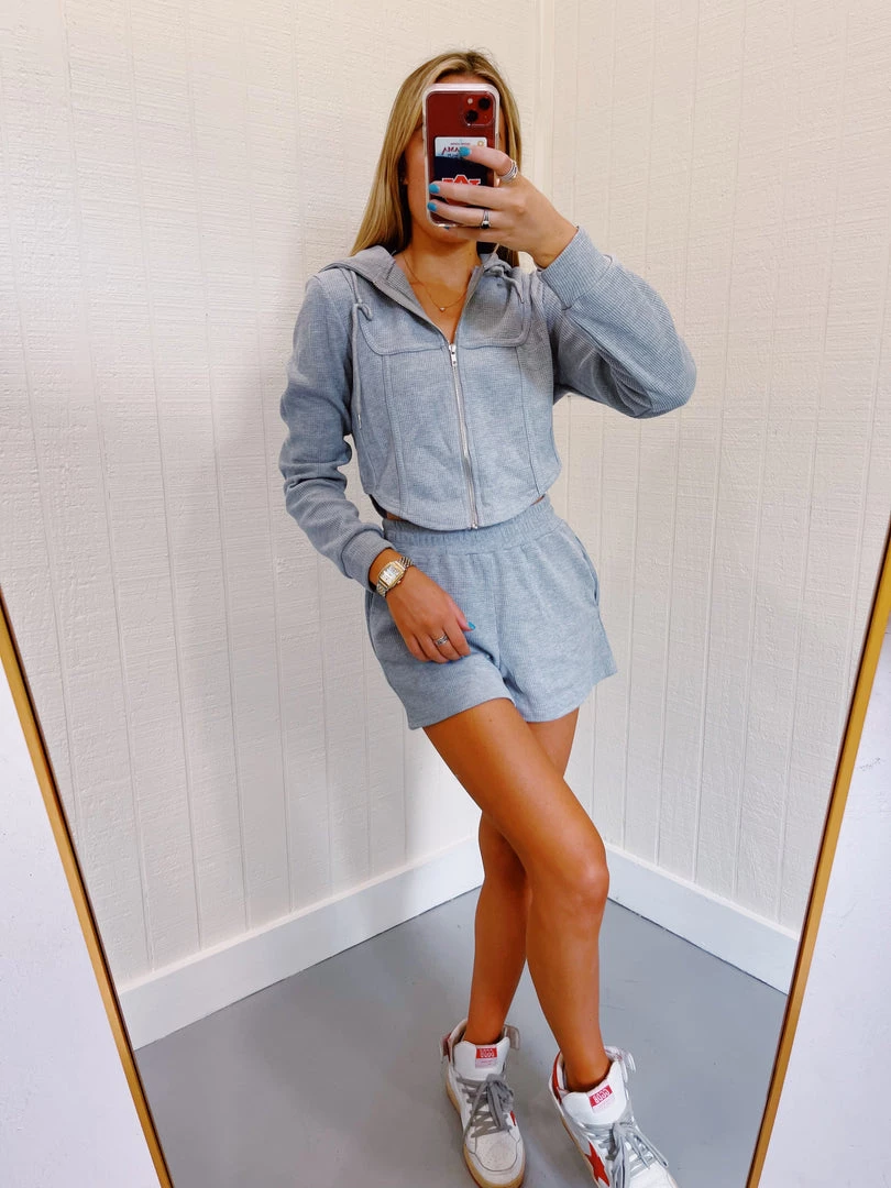 Long sleeve waffle thermal cropped hooded jacket and elastic waistband short set. 65% POLYESTER 35% COTTON