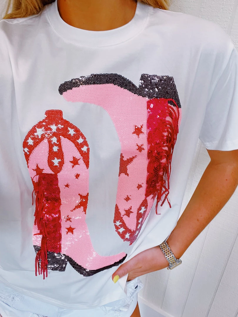 White tee with full sequin and fringe cowgirl boots