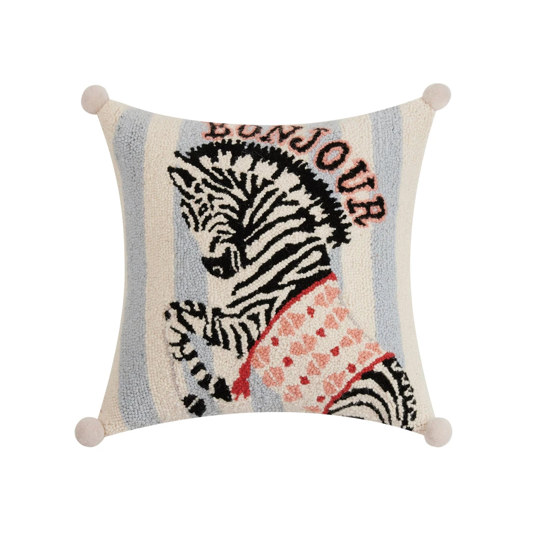 ★100% wool hooked accent pillow ★100% cotton velvet backing ★Includes polyester insert, zipper closure ★18X18″ lumbar throw pillow ★Designed by Yvonne Ellen