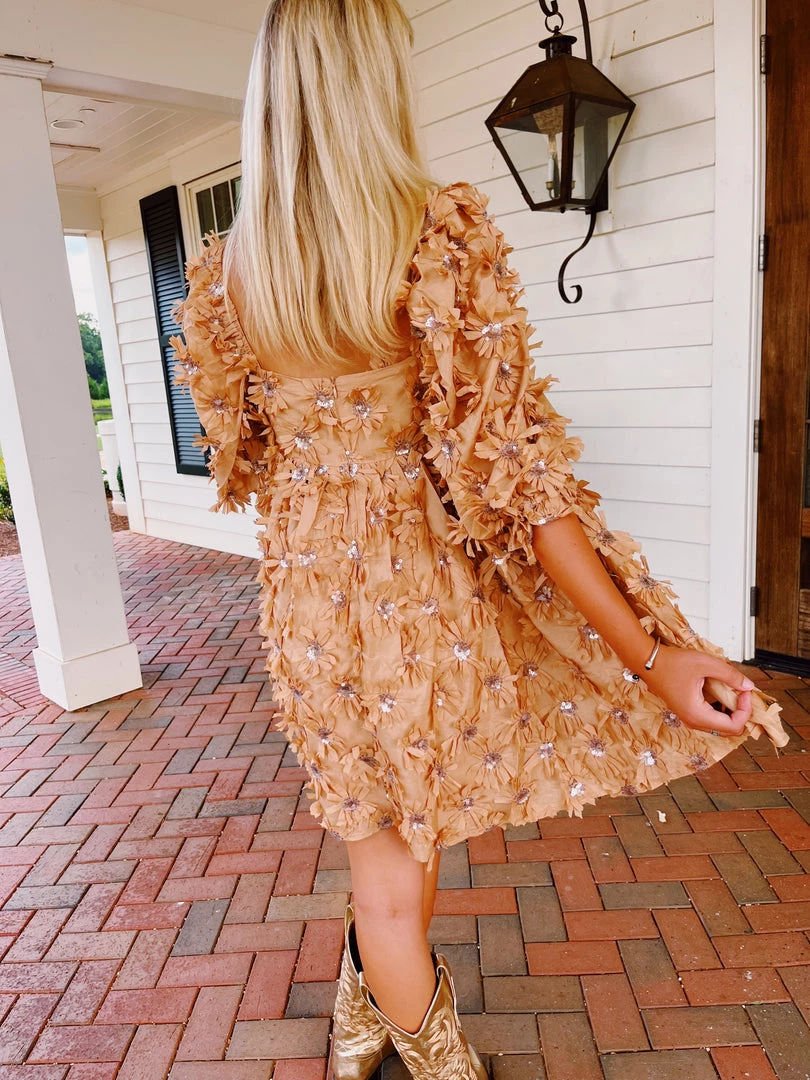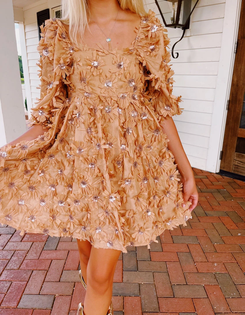 3-D daisy with sequin center babydoll dress. It has a square neckline on its 3/4 puff sleeves and two bust darts. It has an empire gathered waist and back zipper.