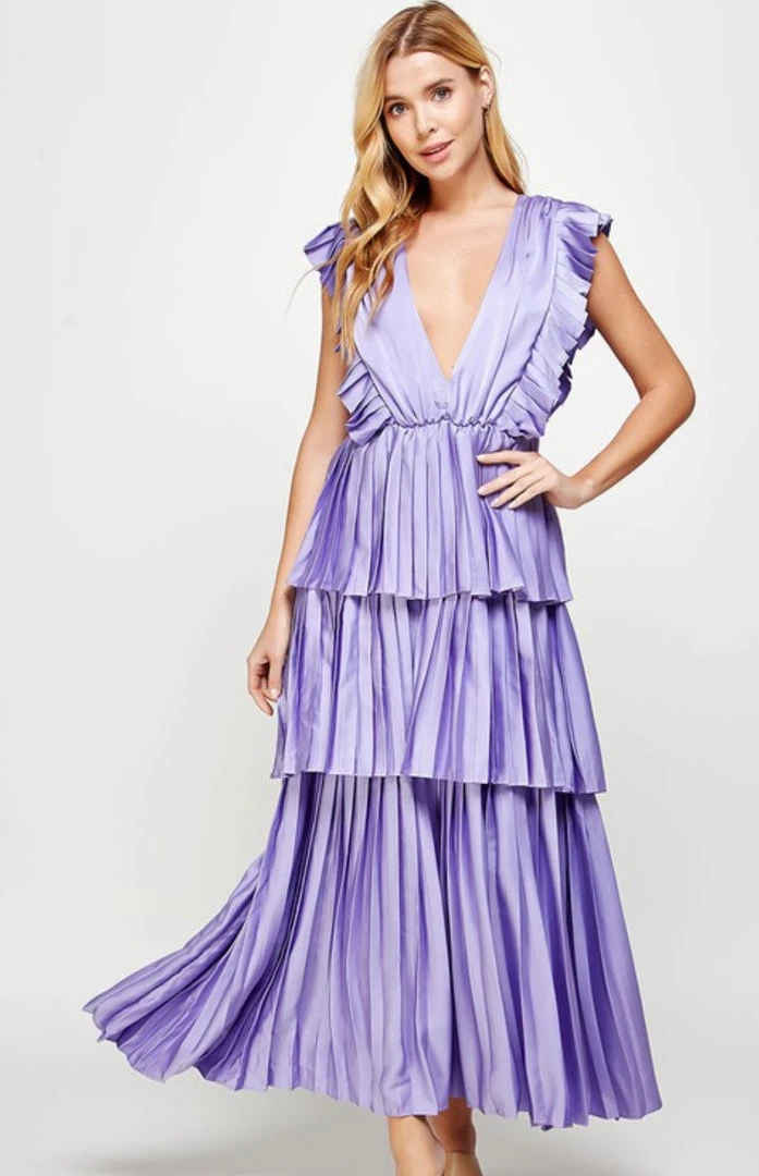 Sleeveless pleated layered maxi dress in satin. This style features a plunging V neckline, pleated ruffled sleeves, pleated multi layered skirt, flattering elasticated waist, and tie closure at back.