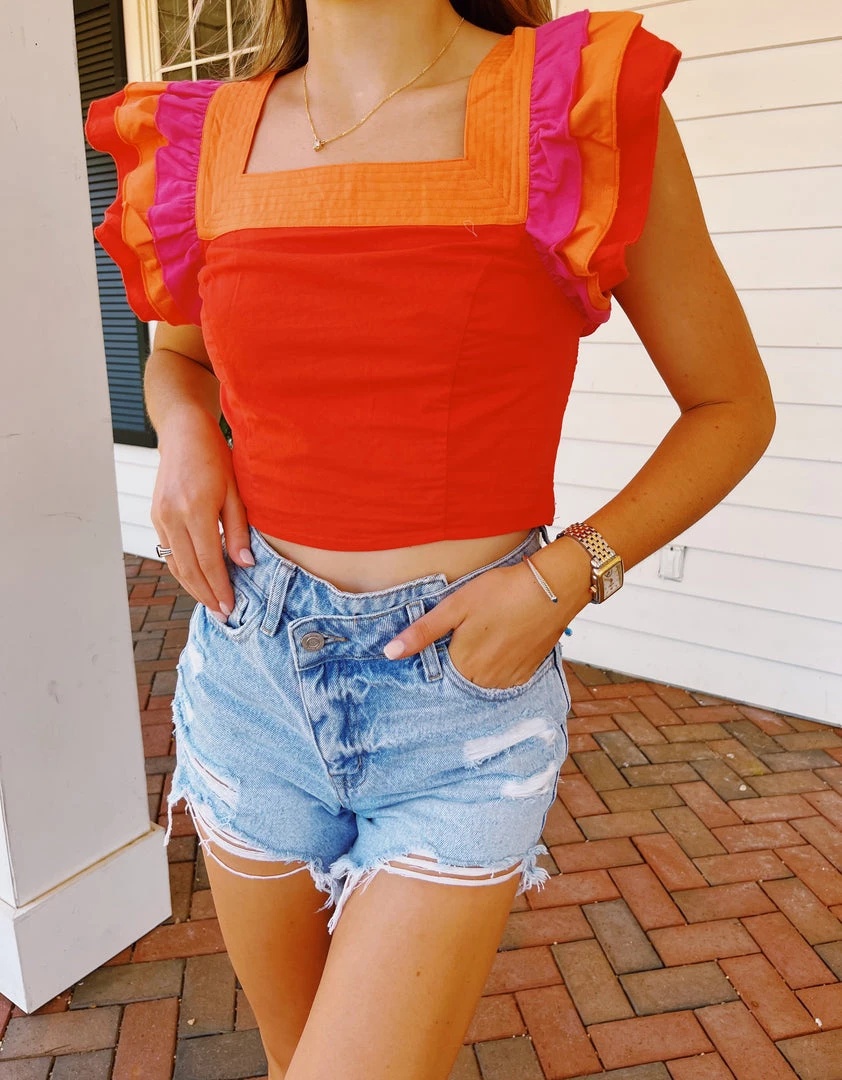Color block sleeveless ruffled crop top in cotton woven fabric. This style features color blocked ruffled shoulders, a square neckline with top stitch detail, smocked back for flattering, and intricate crossed ruffled strap at back.