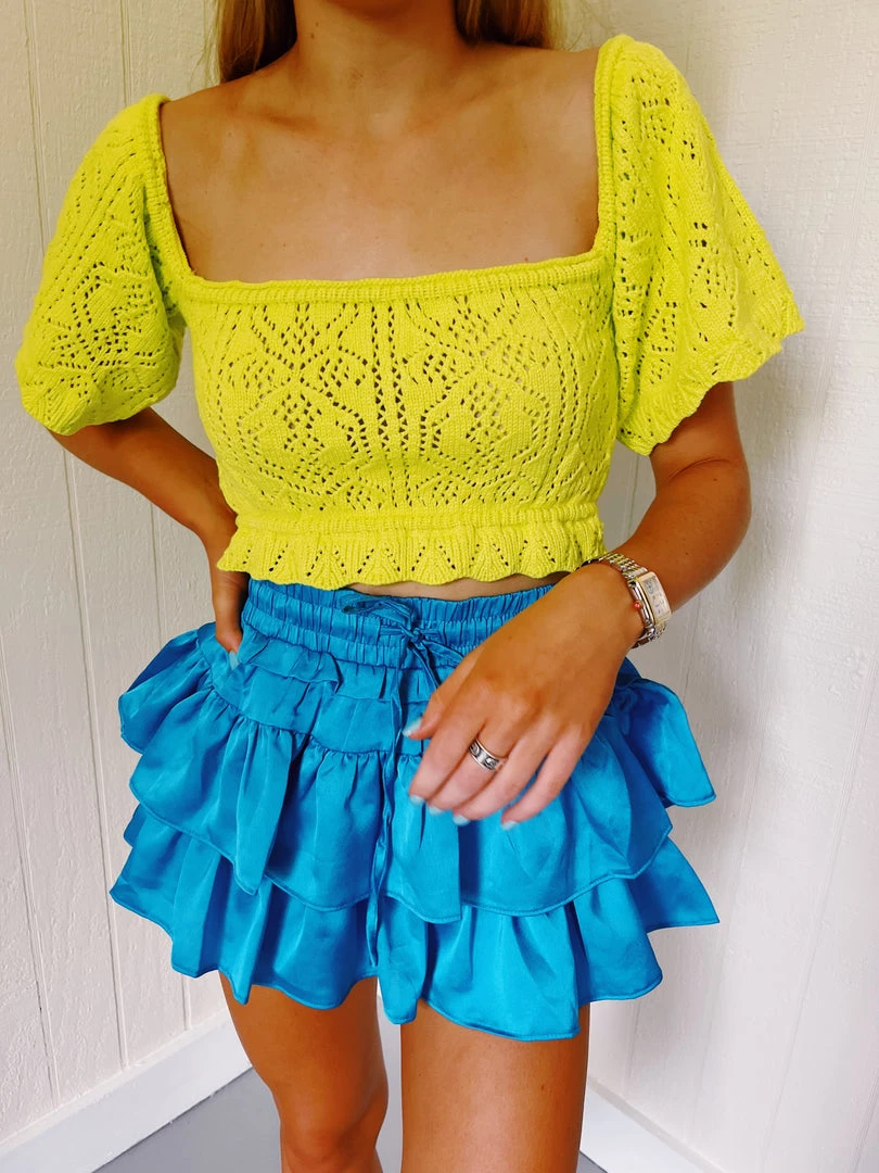 SHORT BUBBLE SLEEVE JACQUARD MESH CROP TOP