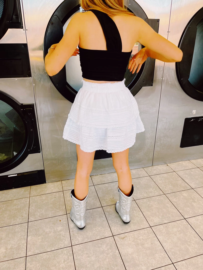 One shoulder top with a sweetheart neckline and a knot detail with cutout on the front.
