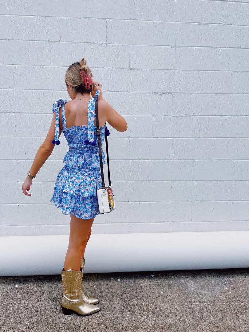 Blue and pink combo floral dress with tie shoulders and pompom details on the end of the ties!