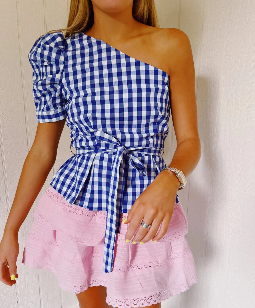 One shoulder, puff sleeve top, features adjustable tie belt, and loose A line bottom.