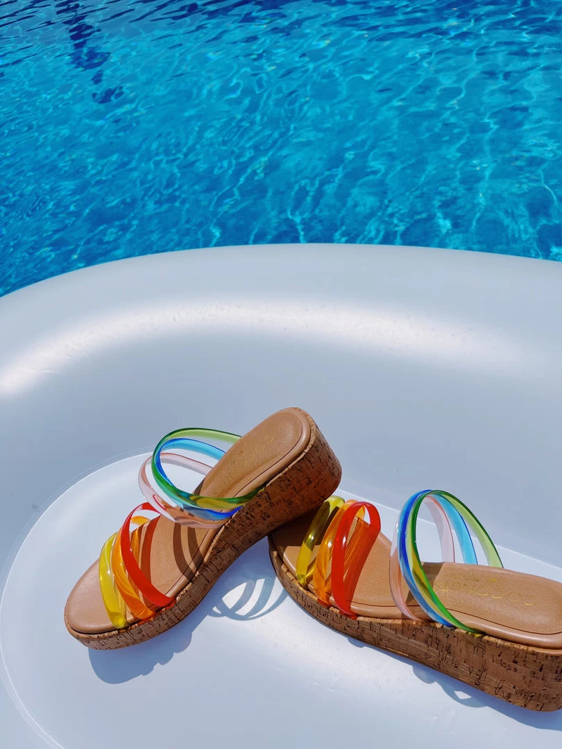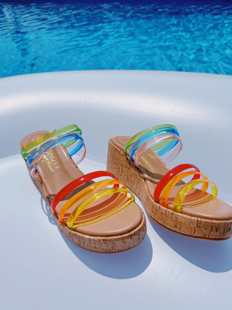 Vegan sandal with vinyl upper and cork-wrapped platform wedge.