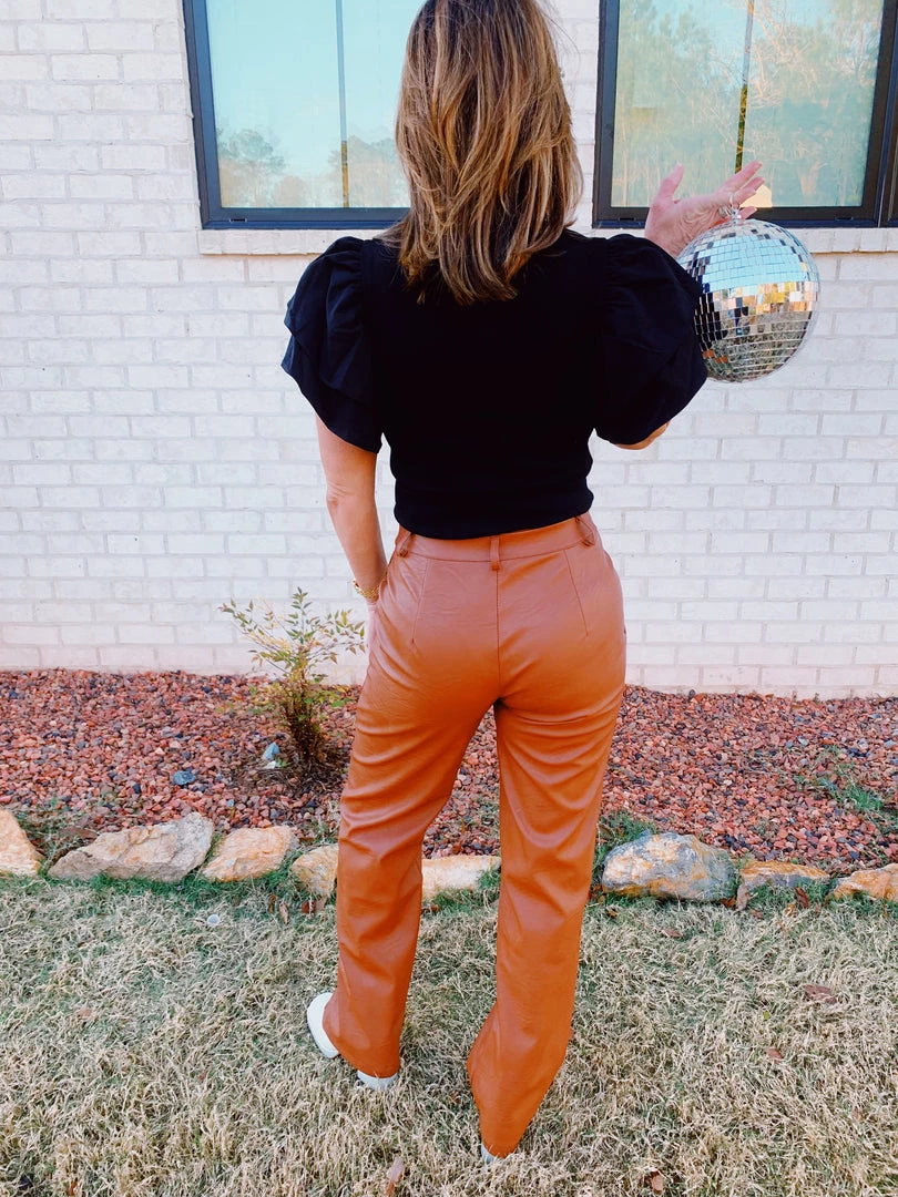 Darted back wide leg pleather dress pant with side pockets in the front.