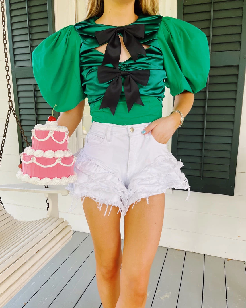 Short sleeve cutout top featuring bows and a pleated detailing! Zipper closure in the back.