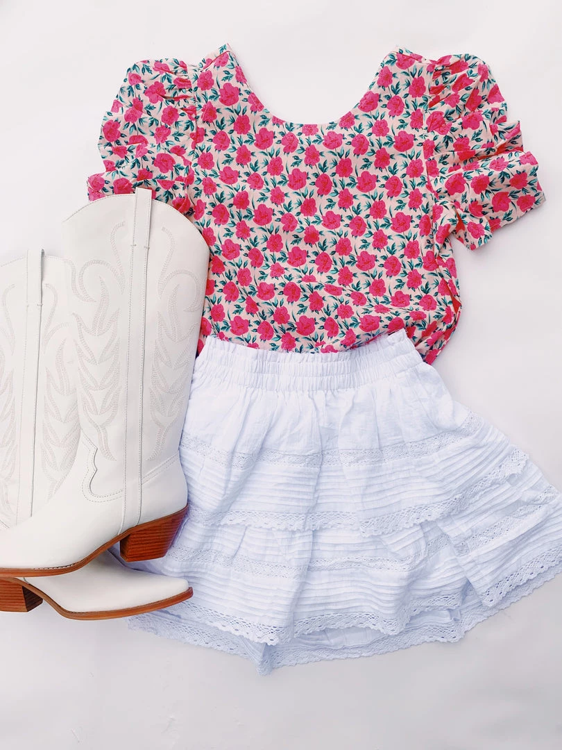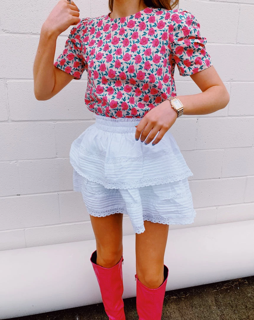 Floral blouse with short, bubble sleeves and straight, relaxed fit.