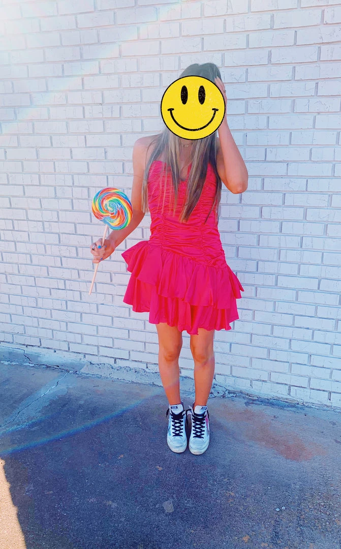 A STATEMENT DRESS! This dress is pink with ruched detailing and all the structure to give it a perfect fit.