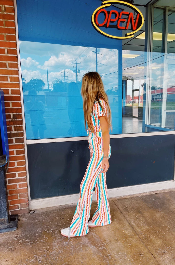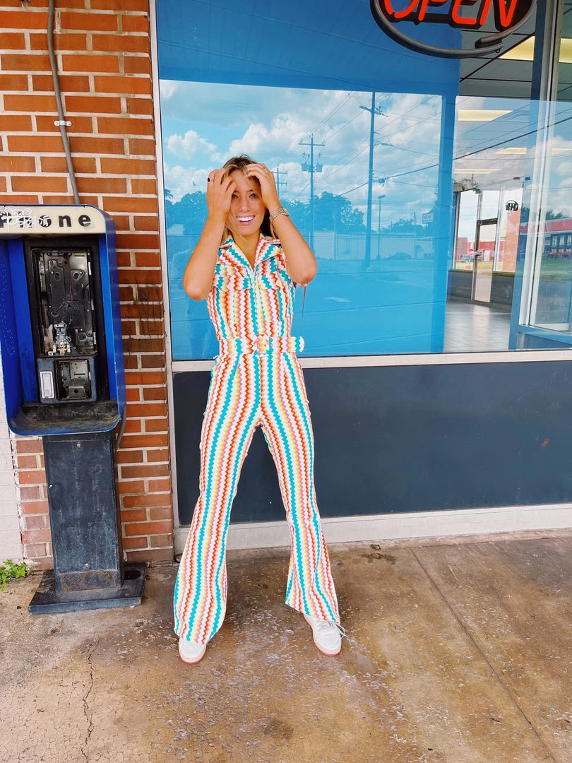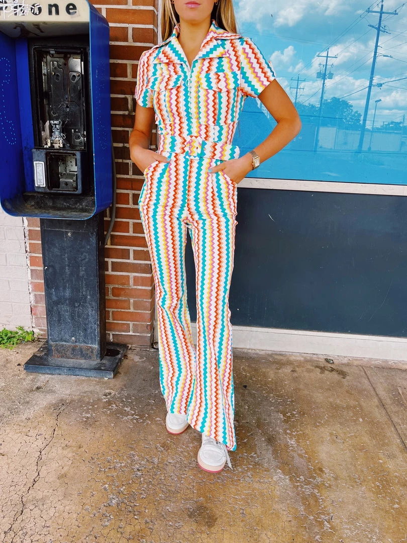 Zig zag striped jumpsuit with a rainbow coloration! This jumpsuit has a belt and front pockets.