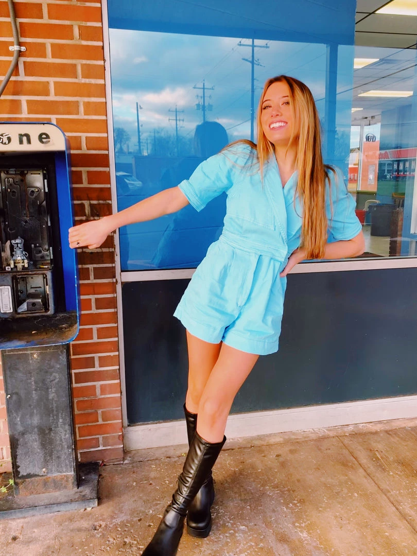 PUFF SLEEVE COLLARED DENIM ROMPER Stretchable fabric