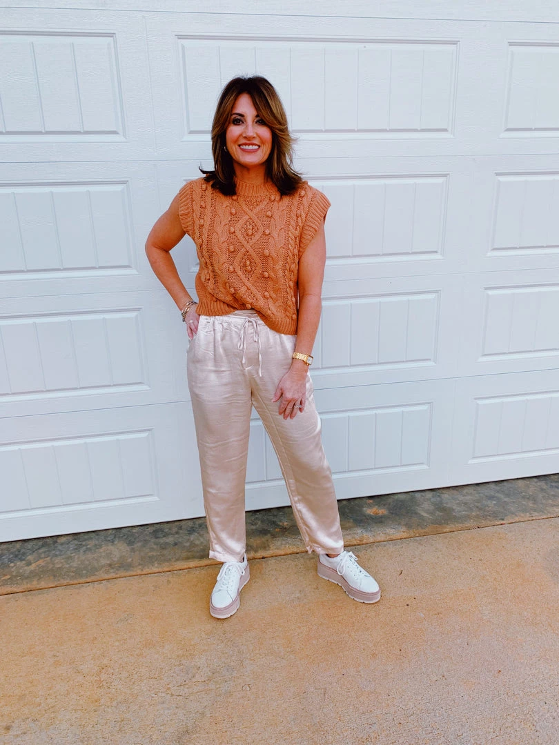 Such an easy to wear pair of pants! These pull on satin pants have a drawstring waist and are a pretty cream color.