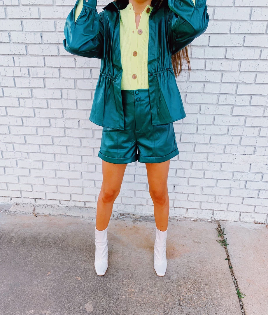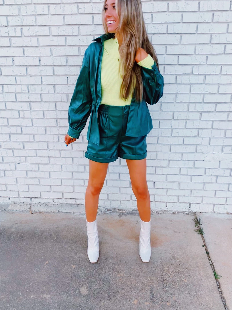 Double Overlap Faux Leather Shirt Jacket. This “shacket” features surplice V neckline with snap button closure, elastic at waist for flattering, spread collar, and long sleeves with buttoned cuff.