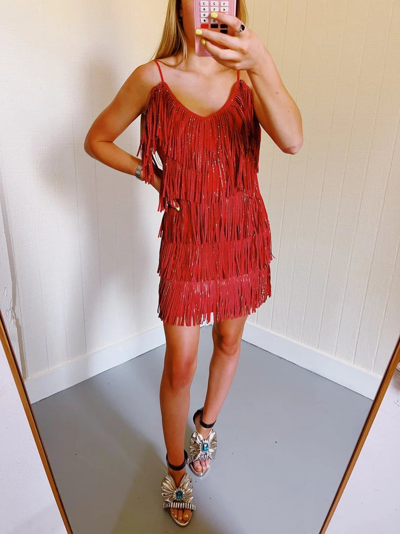 Stand out in our full fringe “Shimmy Dress” — perfect for brides or cocktail party! This runs true to size.
