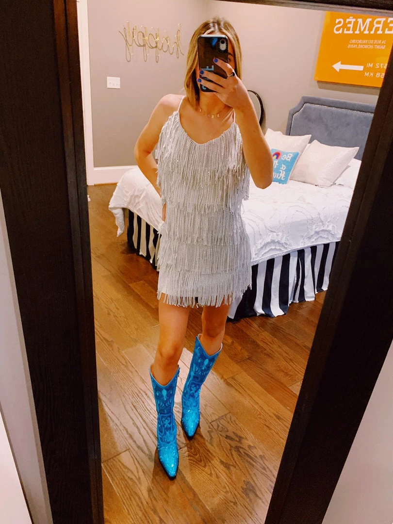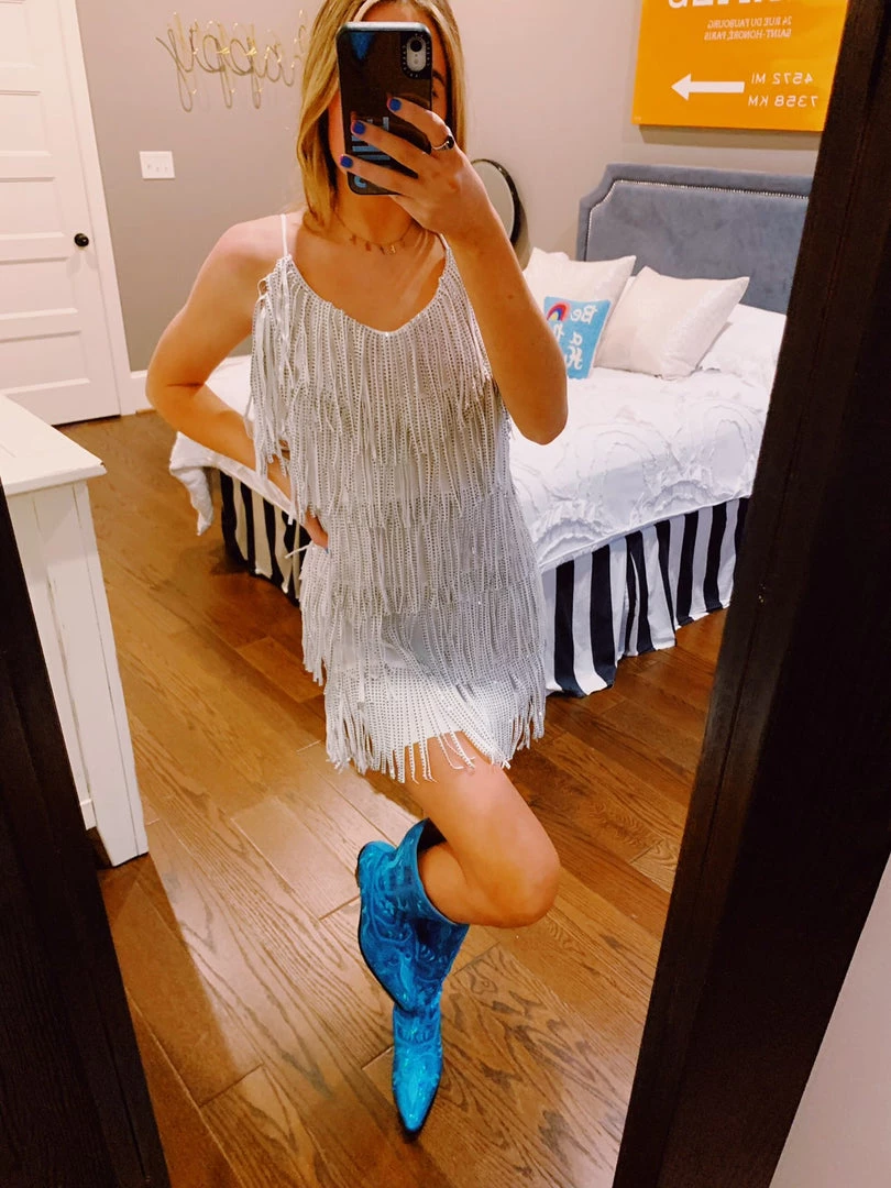 Stand out in our full fringe “Shimmy Dress” — perfect for brides or cocktail party! This runs true to size.