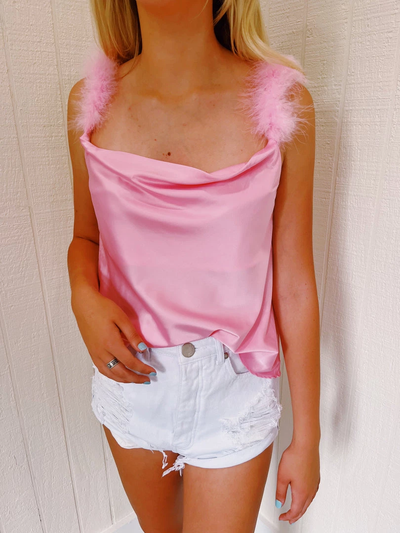 Pink cami with a satin lIke material ane feather sleeves! This has a cute cowl neckline and spaghetti strap sleeves.